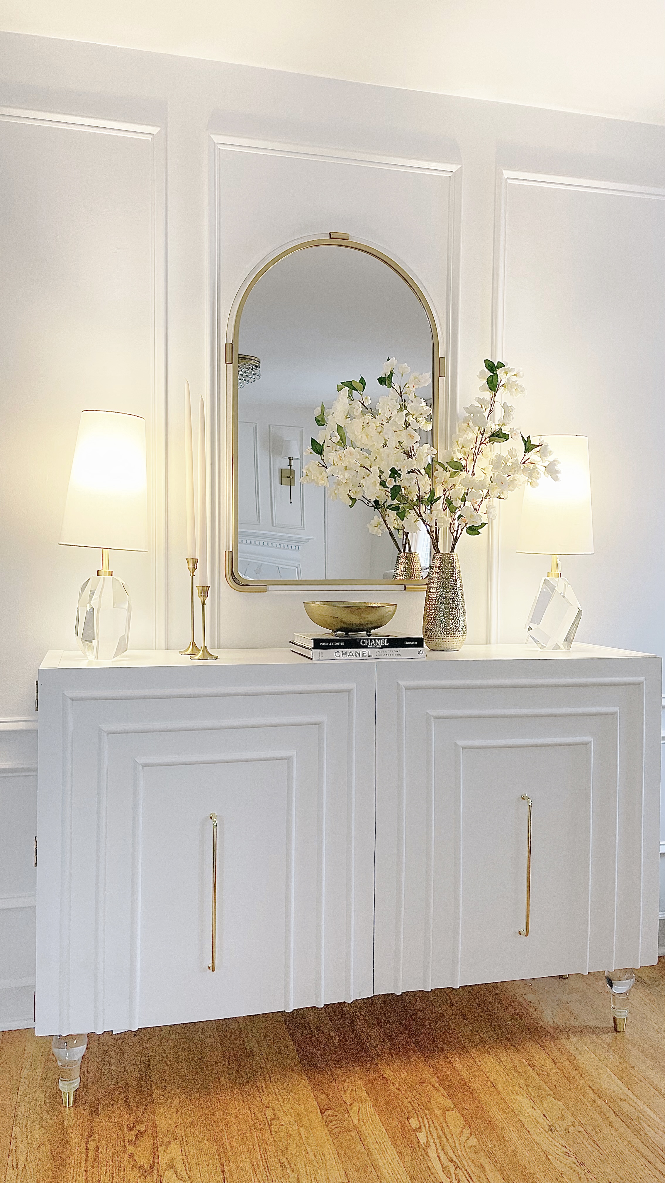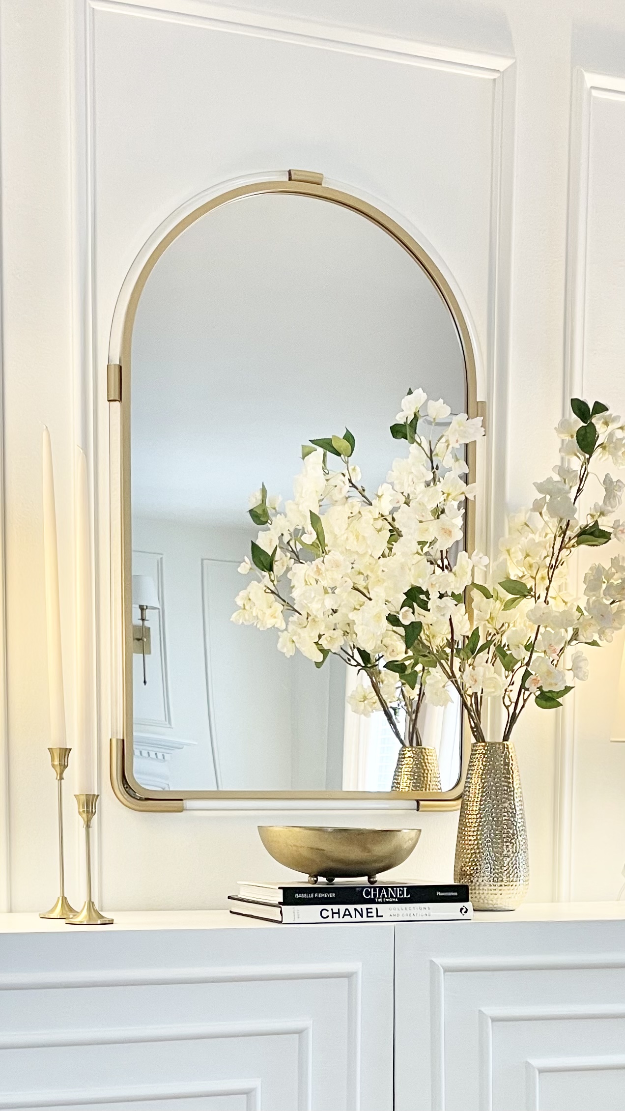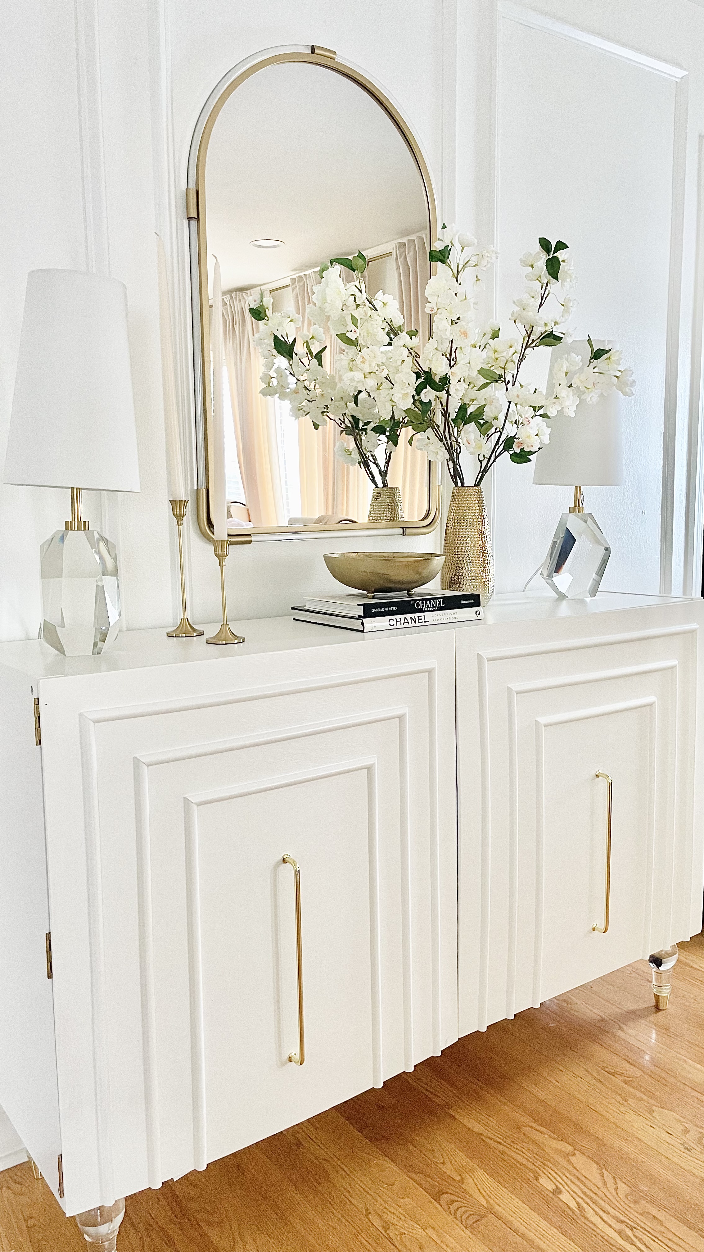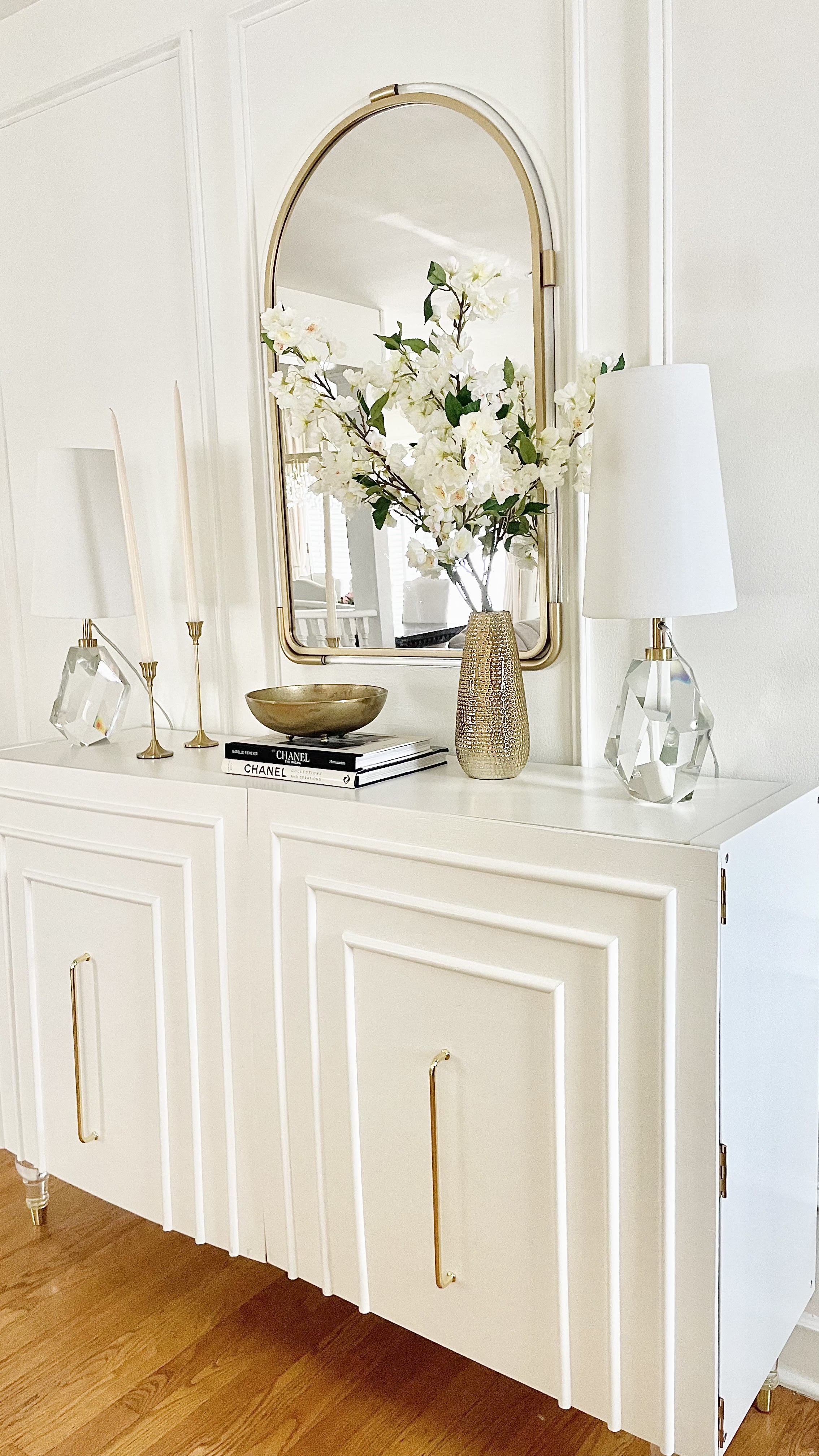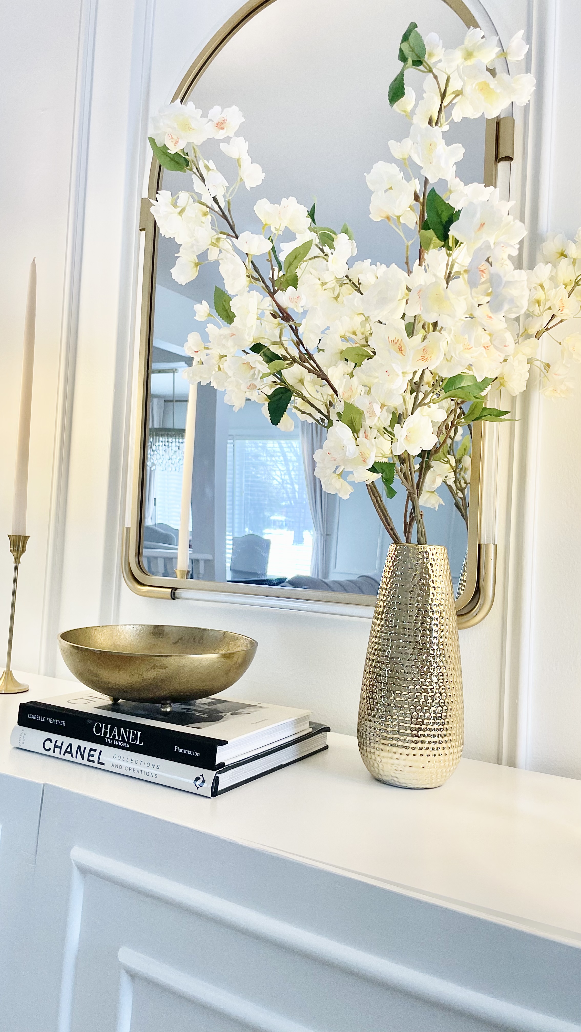 I'm here to share with you how I styled my entryway table to add warmth as I enter my main door. Your entry sets the tone for the rest of your home so it's important to find balance when choosing decor. Ever since I updated this space last summer it has been one of my favorite spot to style in my home. I like to showcase meaningful items. My crystal lamps will always be on this table no matter the season. These were an investment but a very great purchase. Adding some sort of lighting is important on your entryway table and a lamp is my first choice. Considering the wall and the furniture is white, I like to warm it up with brass details. It's winter and I chose white and creamy floral for my arrangement. A beautiful floral arrangement always make me happy. I do like a pop of color but if you read my last blog post I explained the need for a neutral look after all the greenery and brilliant burgundy and red I used for Christmas. Although my floral is white, the gold vase add the warmth I'm yearning for. Stacking books are a great way to display personality on your table top as well. Here is my winter entry table styling. This post contains affiliate links for your convenience. Read my Disclosure Policy here.